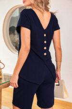 Shorts alongado com decote em V na frente e nas costas com detalhes em botões.